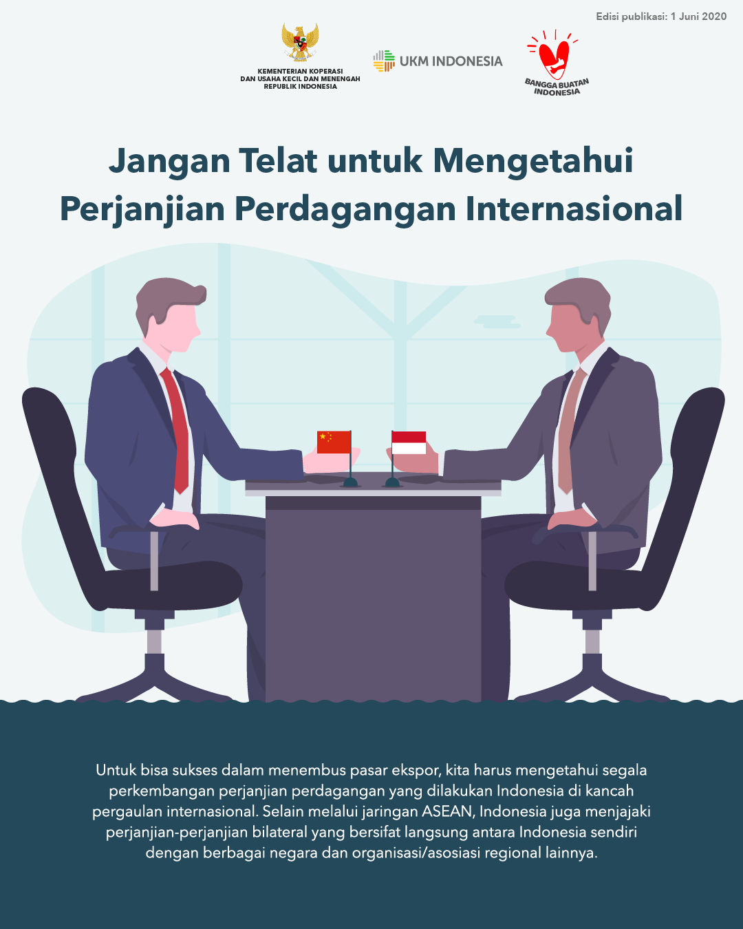 Untuk bisa sukses dalam menembus pasar ekspor, kita harus mengetahui semua perjanjian perdagangan yang dilakukan Indonesia di internasional. Jadi, tidak bisa kita hanya tahu sebatas ASEAN FTA. Dengan membaca artikel ini, sahabat UKM akan mengetahui secara ringkas perkembangan segala perjanjian perdagangan yang sedang dilakukan Indonesia.