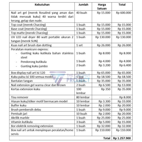 Namun, estimasi di atas belum termasuk untuk fasilitas dan furniture seperti kursi dan meja, sewa tempat jika lokasi bukan di rumah, dekorasi tempat, karyawan jika diperlukan , serta biaya pelatihan bagi nailist bersertifikat.