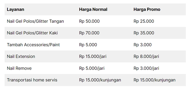 Dengan modal sekitar Rp1.257.900, kita hitung perkiraan keuntungan berdasarkan harga dan promo. Biasanya bagi pemula, memerlukan waktu sekitar 1 jam untuk menyelesaikan Nail Gel polos atau Glitter tangan.