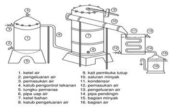 Cara destilasi uap digunakan untuk minyak yang berasal dari cengkeh, nilam, sereh, pala, kayu putih, akar wangi, kenanga, jahe, jeruk purut, gaharu, cendana. Sereh sebanyak 3ton nantinya dapat menghasilkan 10kg minyak atsiri. Sedangkan daun cengkeh, dapat menghasilkan 5% dari rendamannya selama 5-6jam.
