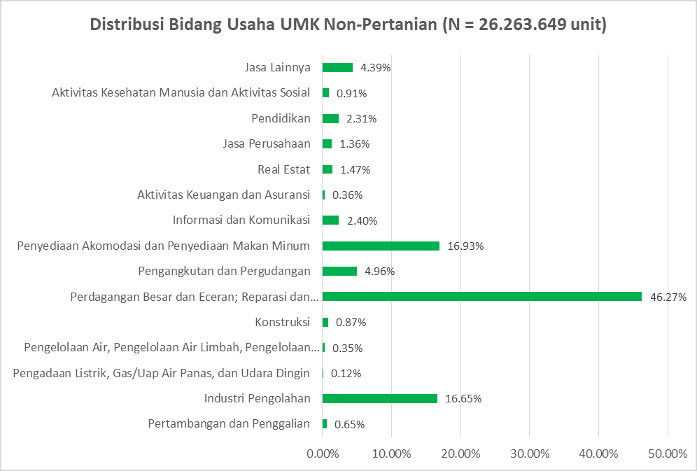 Jumlah UMKM sangat banyak. Jika dibandingkan dengan jumlah unit Usaha Besar yang hanya sekitar 5.500 unit, maka jumlah UMKM lebih dari 10.000 kali lebih banyak! UMKM sebanyak itu, bergerak di bidang usaha apa saja, ya?