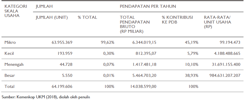 Tanpa UMKM, maka mayoritas orang Indonesia tidak akan punya pekerjaan. UMKM, khususnya Usaha Mikro, juga menjadi sarana mempekerjakan diri sendiri bagi puluhan juta orang Indonesia. Kementerian Koperasi dan UKM RI melaporkan bahwa dari total sekitar 64,2 juta unit usaha yang ada di Indonesia (2018), 99,99% adalah UMKM , sementara Usaha Besar hanya 0,01% atau sekitar 5550 unit.