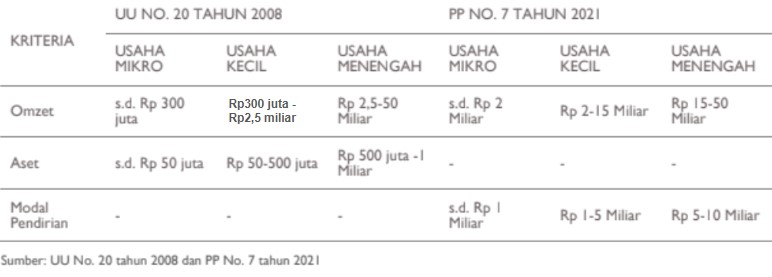 Tabel 1. Perbandingan Kriteria UMKM dan Usaha Besar Berdasarkan UU No.20/2008 versus PP No.7/2021
