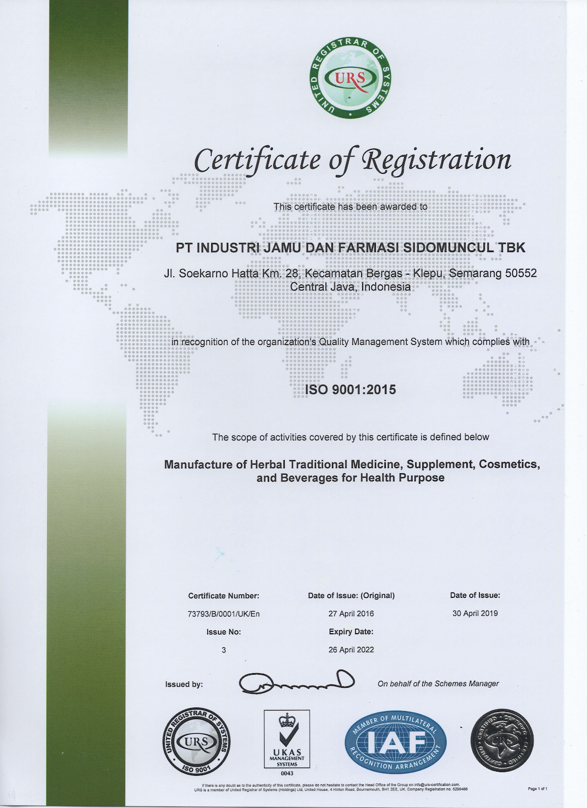Gambar : Salah satu sertifikat ISO 9001 yang dimiliki PT. Industri Jamu Dan Farmasi Sido Muncul, Tbk.