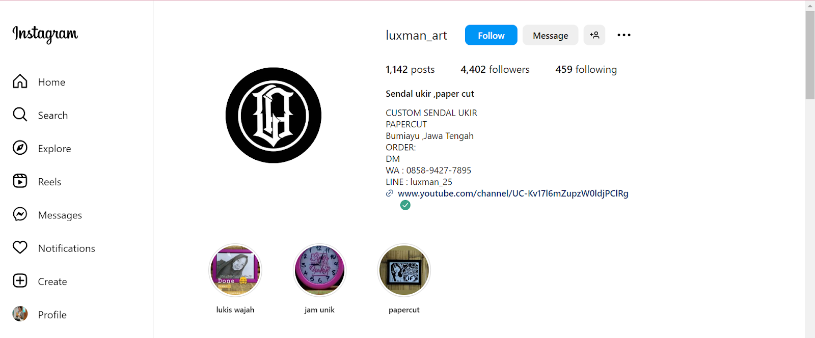 Dalam hal pemasaran, Lukman memilih platform media sosial, khususnya Instagram, sebagai kanal utama untuk memasarkan sandal jepit ukirnya. Melalui akun Instagram pribadinya dengan nama pengguna @luxman_art, Lukman berhasil menciptakan eksposur yang cukup luas, menarik perhatian pelanggan potensial. Selain itu, ia juga memanfaatkan WhatsApp dan komunitas ukir di grup WhatsApp sebagai saluran tambahan untuk mendapatkan pesanan.