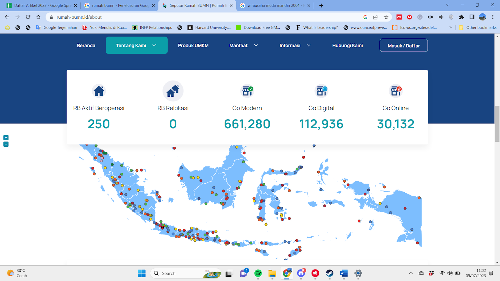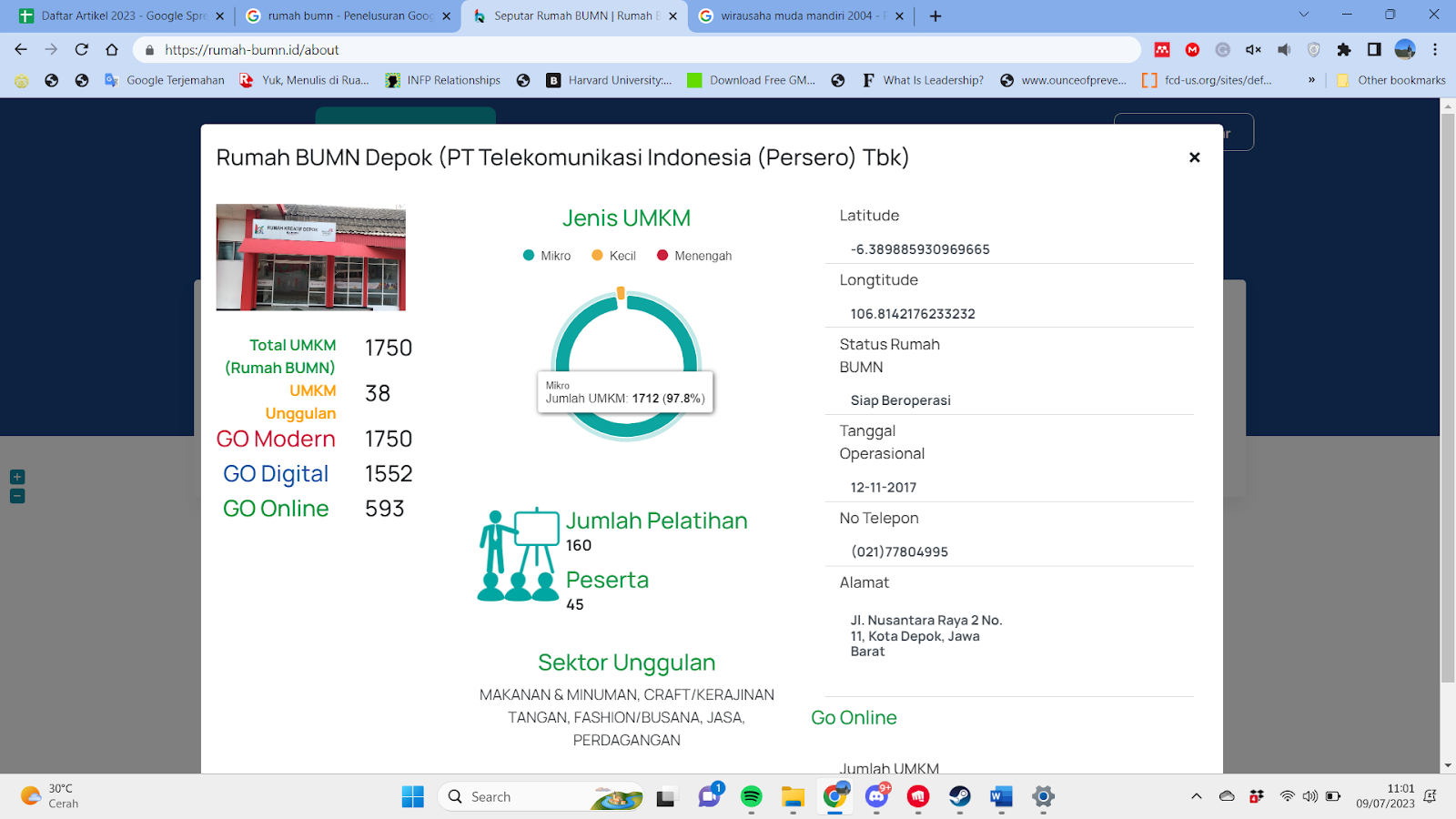 Dalam melihat informasi yang lebih detail, Sahabat Wirausaha dapat melakukan pengecekan di halaman https://rumah-bumn.id/about. Pada halaman tersebut, kita dapat melihat peta persebaran Rumah BUMN dan mencoba mencari lokasi yang ingin diketahui lebih lanjut. Pada Gambar 1, kita dapat melihat detail lokasi Rumah BUMN Depok yang dikelola oleh Telkom.