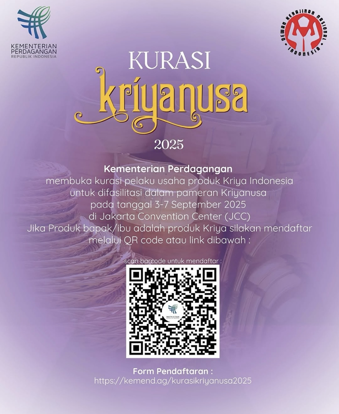 Kementerian Perdagangan membuka kurasi bagi pelaku produk Kriya Indonesia untuk difasilitasi dalam Pameran Kriyanusantara pada tanggal 3-7 September 2025 di Jakarta Convention Center (JCC).