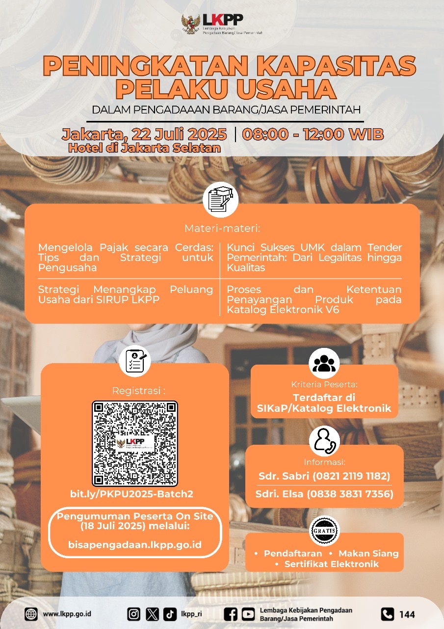 Dalam rangka mendorong partisipasi aktif pelaku usaha, khususnya Usaha Mikro dan Kecil (UMK), dalam ekosistem Pengadaan Barang/Jasa Pemerintah, LKPP menyelenggarakan kegiatan Peningkatan Kapasitas Pelaku Usaha yang bertujuan memberikan pemahaman dan keterampilan praktis agar pelaku usaha dapat lebih siap, cakap, dan percaya diri dalam memanfaatkan peluang pengadaan pemerintah.