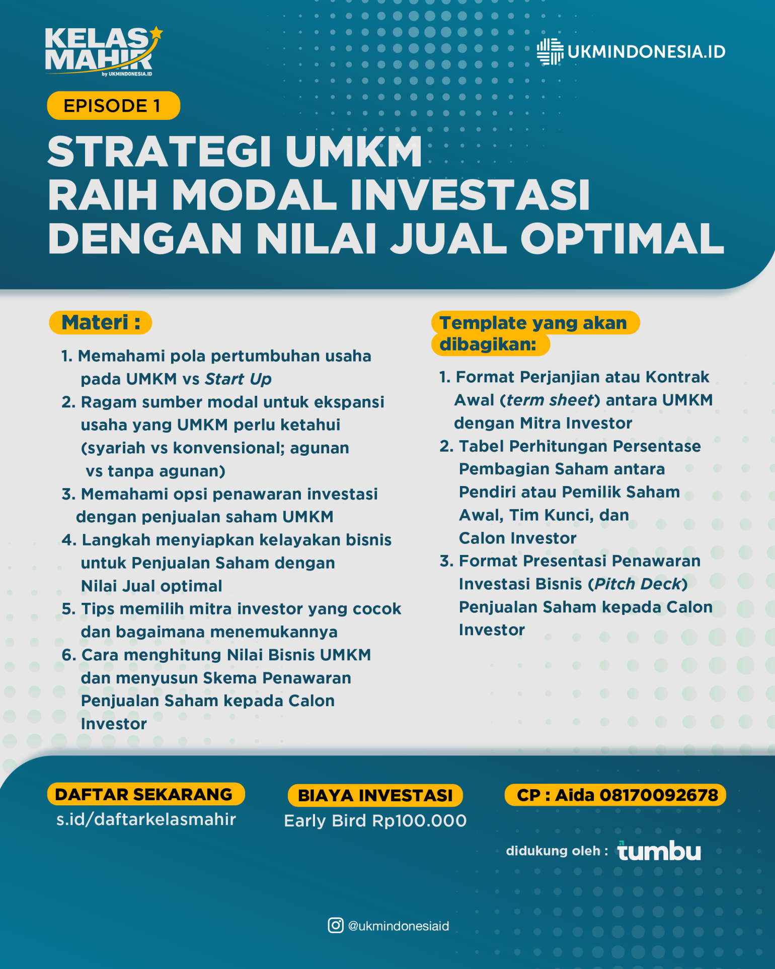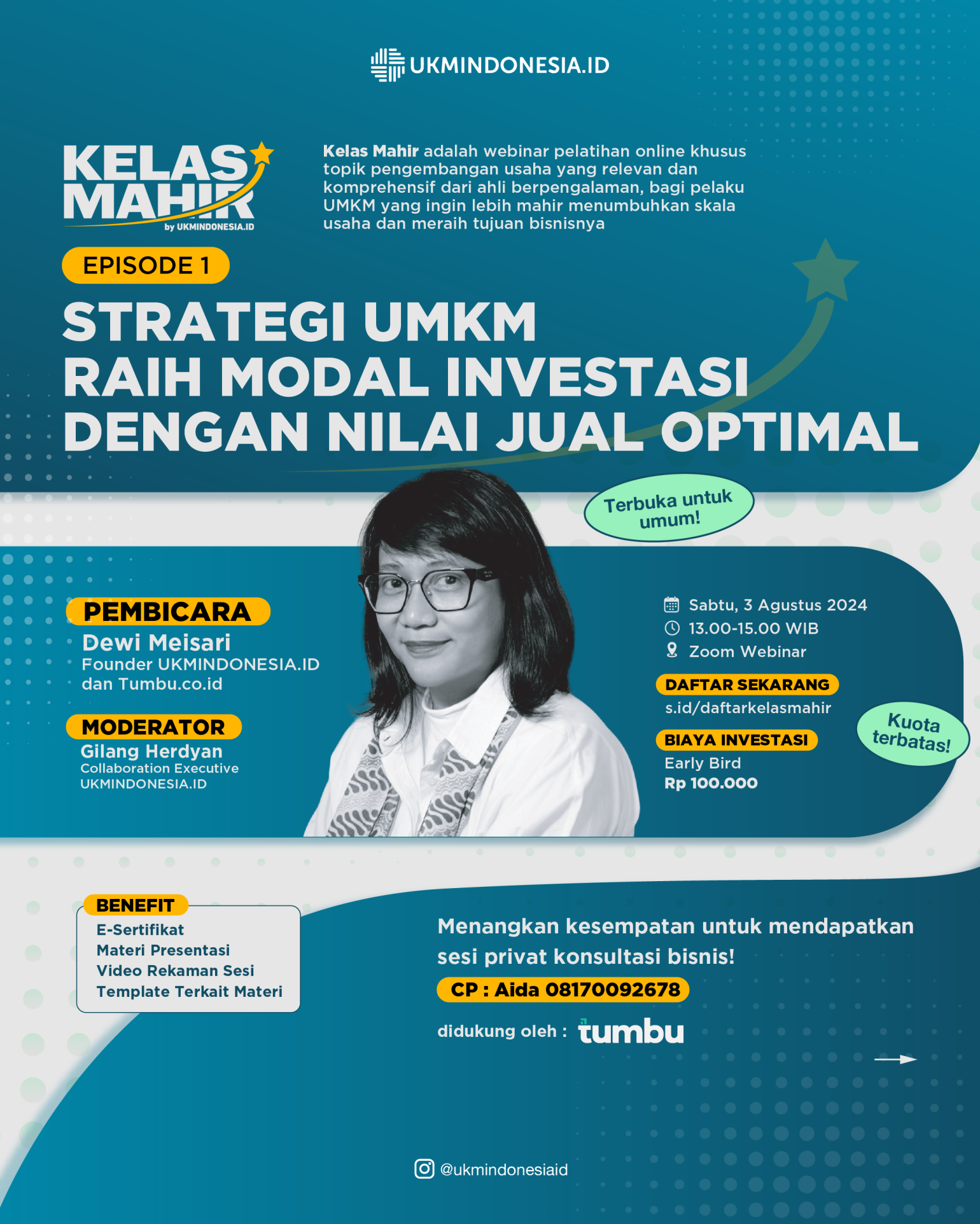 Di KELAS MAHIR, Dewi Meisari Haryanti, Founder ukmindonesia.id dan Tumbu akan ngajarin kamu tentang STRATEGI UMKM MERAIH INVESTASI DENGAN NILAI JUAL OPTIMAL.